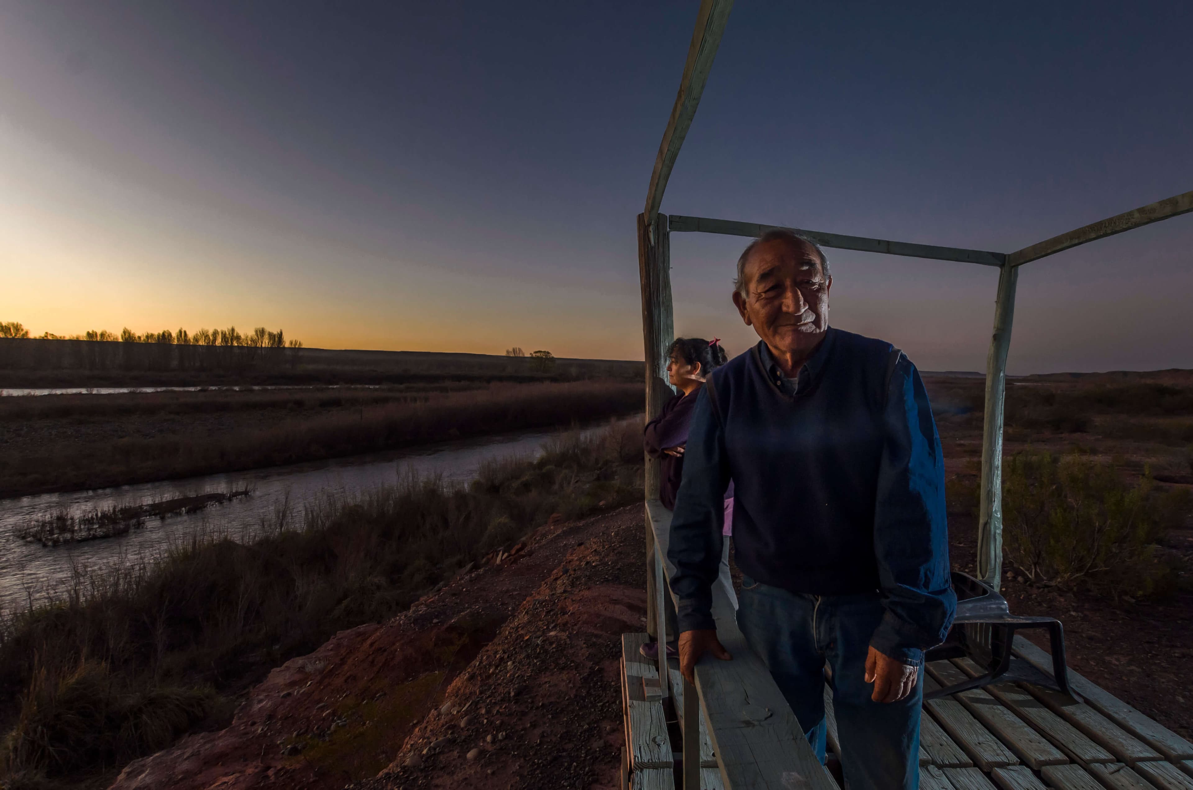 La toma de agua en el río está en el sector de la costa que a Damiana Paynemil y Alberto Mardones les fue usurpada en plena dictadura militar. Nada es casual en el derrotero de la apropiación. Y a ello se suma la Ruta 7, que pasó de ser un camino de tierra poco transitado a tener una altísima circulación de camiones y camionetas petroleras, con numerosos accidentes, y riesgosa para el cruce de los animales y para las personas. Esto, además del conflicto con las chacras, llevó a Martín a trasladarse al puesto arriba en la meseta hace más de 20 años, cuando todavía había paz, comenta.