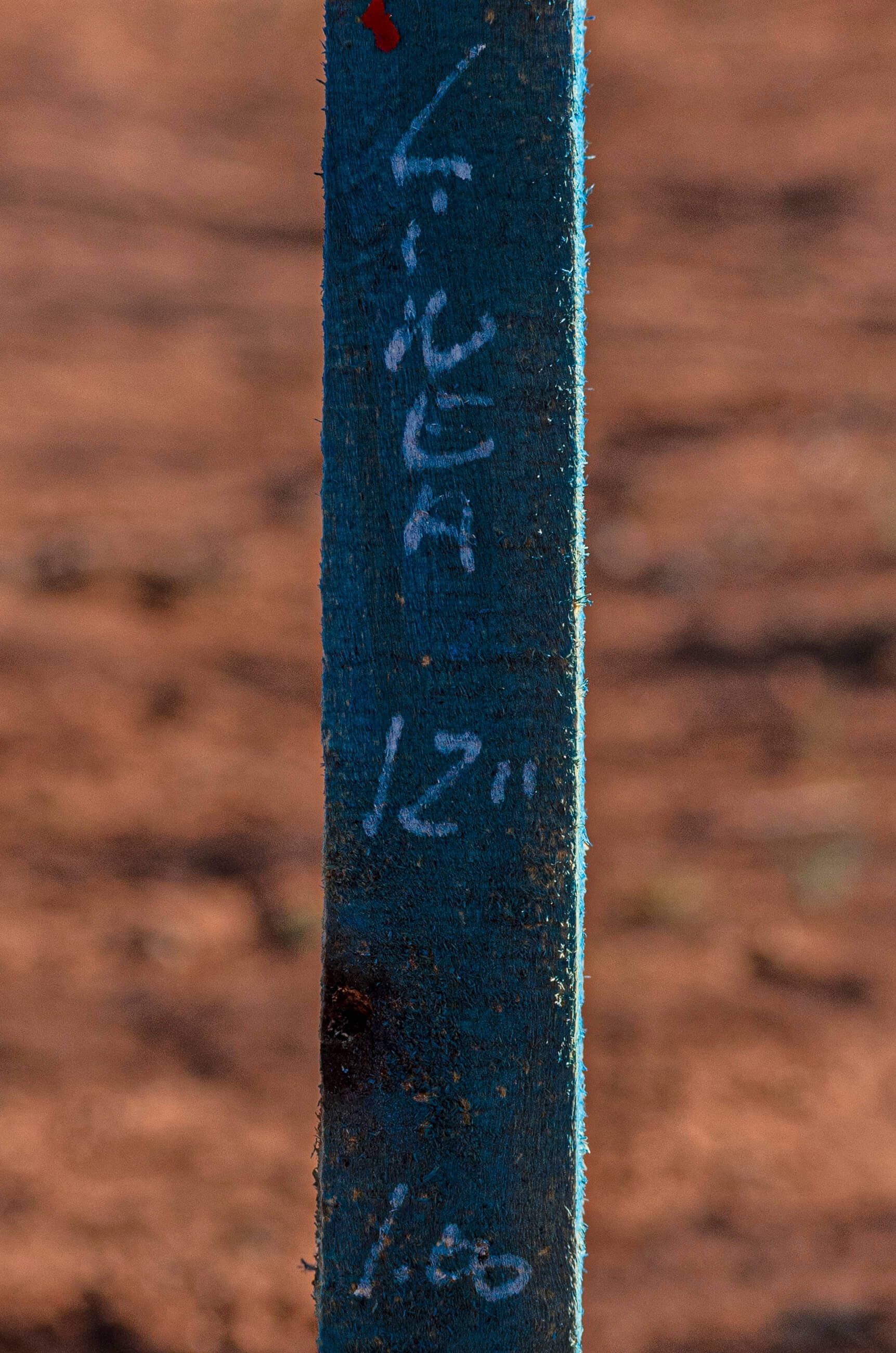 El werken Diego muestra las intervenciones de las empresas en los derrames. Desentierran los caños que están marcados con estacas y los dejan drenar tras las rejas de protección. Septiembre 2022. Tratayen. Neuquén. Foto: Carolina Blumenkranc.